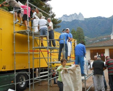 Nous attendions tous le camion pour 9 h, mais il est arrivé à 10 H 35’. Le temps qu’il se mette en position il a fallu attendre à 11 H pour le début de chargement (petite précision, il y avait aussi en plus le chantier en cours d’aménagement de la route des Prés Bernard).