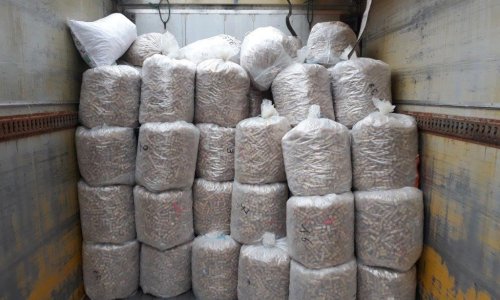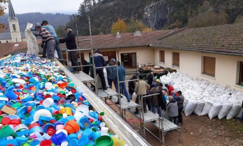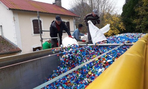 Vous remarquerez sur une des photos que nous commençons par charger les sacs de bouchons plastique "faux liège".