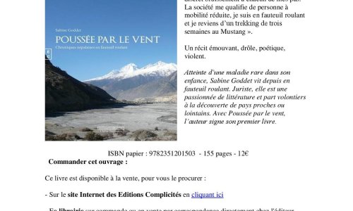 Atteinte d’une maladie rare dans son enfance, Sabine Goddet vit depuis en fauteuil roulant. Juriste, elle est une passionnée de littérature et part volontiers à la découverte de pays proches ou lointains. Avec Poussée par le vent, l’auteur signe son premier livre.