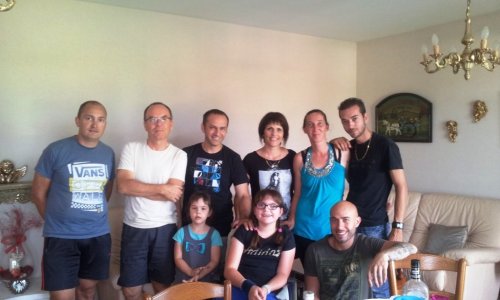 Photos de Mathilde, de ses parents qui nous remercient, ainsi que la photo de l’équipe d’amis qui nous a aidés à installer le lit dans sa chambre.