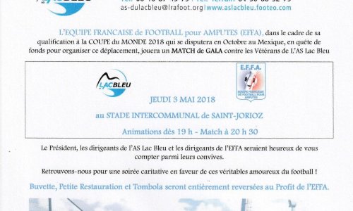 Je me permets de vous transmettre une invitation pour venir assister à un événement le jeudi 03/05 en soirée au stade intercommunal de SAINT JORIOZ : l’AS LAC BLEU accueille l’équipe Française de FOOTBALL pour Amputés (EFFA), lors d’une rencontre amicale avec notre section VETERANS.