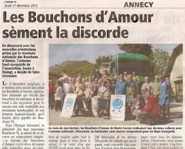 Article de l’Essor savoyard en date du : 27 décembre 2012 ; Les Bouchons d’Amour sèment la discorde