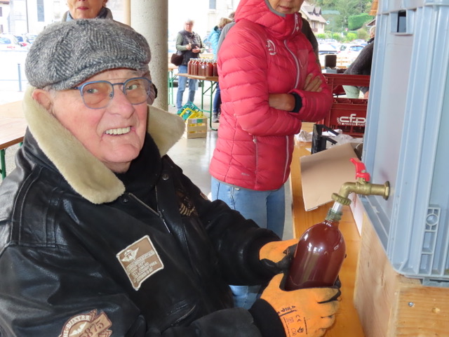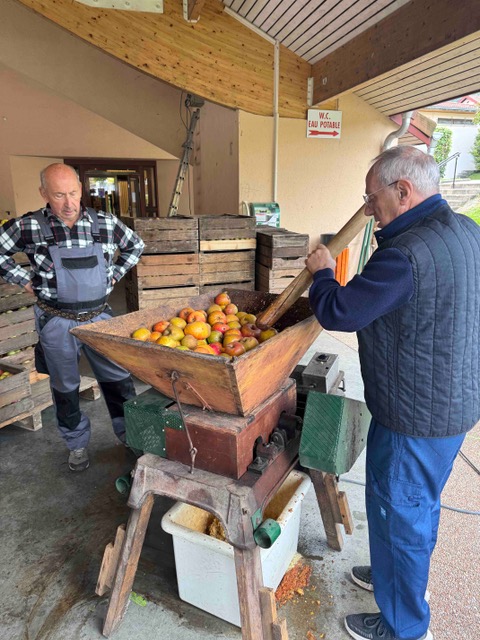 Que ce soit pour le transport des pommes avec des allers-retours chez le producteur, la mise en place du broyeur et du pressoir, tous les approvisionnements tels les ingrédients nécessaires aux cuissons, les bouteilles, les étiquettes, la préparation du bar, la communication, les moyens de paiements, les commandes de pains et de St-Genix, le soin apporté à la collation des bénévoles et bien d’autres choses encore !