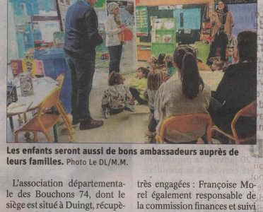 Article du Dauphiné Libéré en date du : 22/01/2023 ; FAVERGES-SEYTHENEX : Les écoliers sensibilisés à la collecte des bouchons