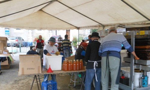 Le samedi matin 05h30, montage du chapiteau abritant la machine du Parc des Bauges qui fait le jus de pomme pasteurisé (jus de pomme chauffé à 80°), du pressoir à vis, de la broyeuse avec son célèbre moteur Bernard (qui tourne comme une horloge), pour le jus de pomme frais.